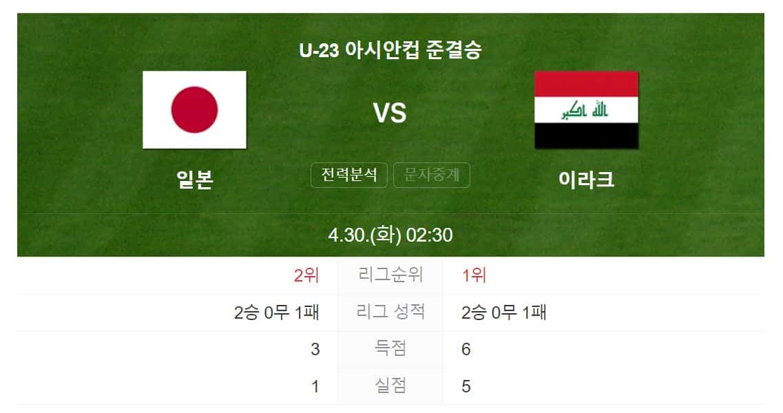 2024 U-23 아시안컵 4강전 일본 VS 이라크 축구 경기는 2024. 4. 30.(화) 우리 시각 기준으로 새벽 2시 30분에 펼쳐집니다.